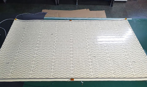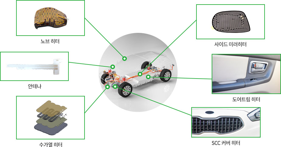 PET(Polyethylene terephthalate)필름 소재에 전도성 은 나노(Conductive Silver Nano) 잉크를 R2R(Roll to Roll) 인쇄방식을 활용해 50~150um의 필름에 1~10 um 두께로 열선인쇄하고, 롤공정으로 열처리하여, 50~125um의 접착 필름을 롤 라미네이팅 공정과 자동 타발기를 통해 제조됩니다.