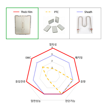 판형의 발열이며, 좁은 면적에 높은 전력 사용이 가능하고, 알루미늄의 열전도율과 잉크의 열전도성이 뛰어나기 때문에 높은 열전도 효율을 갖음
