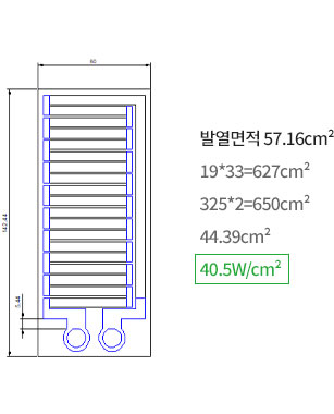- 1~50W/cm²까지 설계하고, 원하는 부위별로 유로의 방향별로, 공기의 흐름별로 전류밀도를 달리하여 효과적인 제품을 구현합니다.
